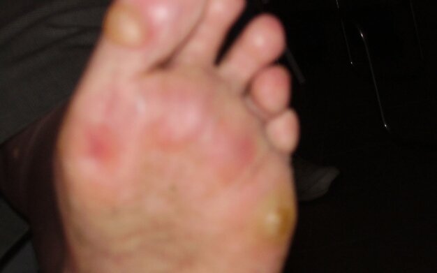 A kisujj perc külső-felső ízületi felszínén, sőt a IV. és V. ujj közötti bőrfelszínen is a bőr megvastagodhat, bőrkeményedés, tyúkszem (clavus) alakulhat ki. A kisujj (V. metatarsus fejecse) alatti területen is kezdetben bőrpír, bőrkeményedés (clavus, esetleg hyperkeratosis) alakul ki.