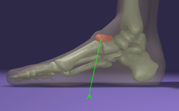 A láb hátoldalán alakulhat ki a „dudor” (A), mely az I-es metatarsus és az I-es ékcsont (Os cuneiforme mediale) között létrejött csontszerű felrakódás.