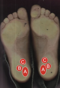 A sarokcsont másik gyakori fájdalmas területe a sarokcsont belső oldali szélén (A) fordul elő kétkörömnyi ovális területen. Többnyire enyhén ferdült helyzetű sarokcsont (calcaneus varus, pes cavovarus) esetében fordul elő. A sarokcsont alatti fájdalmak okozója lehet a sarokcsont kis kinövése, kóros dudora (calcaneus exostosis plantaris) a (B)-vel és (C)-vel jelölt terület között, mely röntgen felvétellel kimutatható.