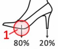 SúlyeloszlásAz elő láb az ujjak alatti területen (1.) (metatarsus) túlterhelődik. Ennek a következménye, hogy a cipő talpa alatt a talaj kis egyenetlenségeit megérzi, ami fájdalommá fokozódhat.
